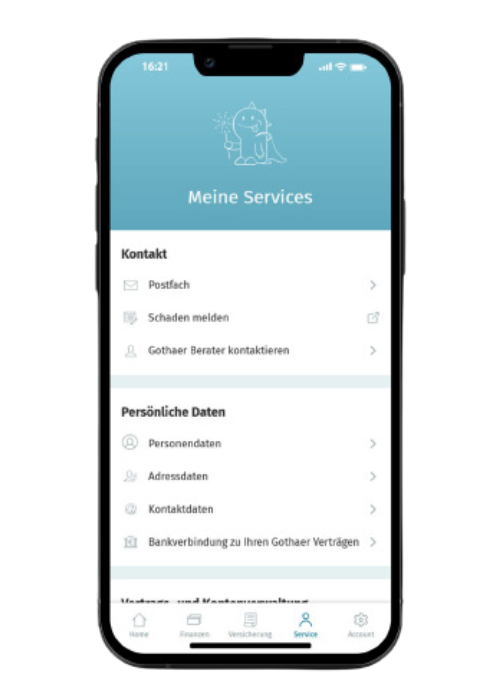 Direkt beim Öffnen der App sind die Kontaktdaten deiner Ansprechperson der Gothaer hinterlegt, so dass du sie unkompliziert erreichen kannst.